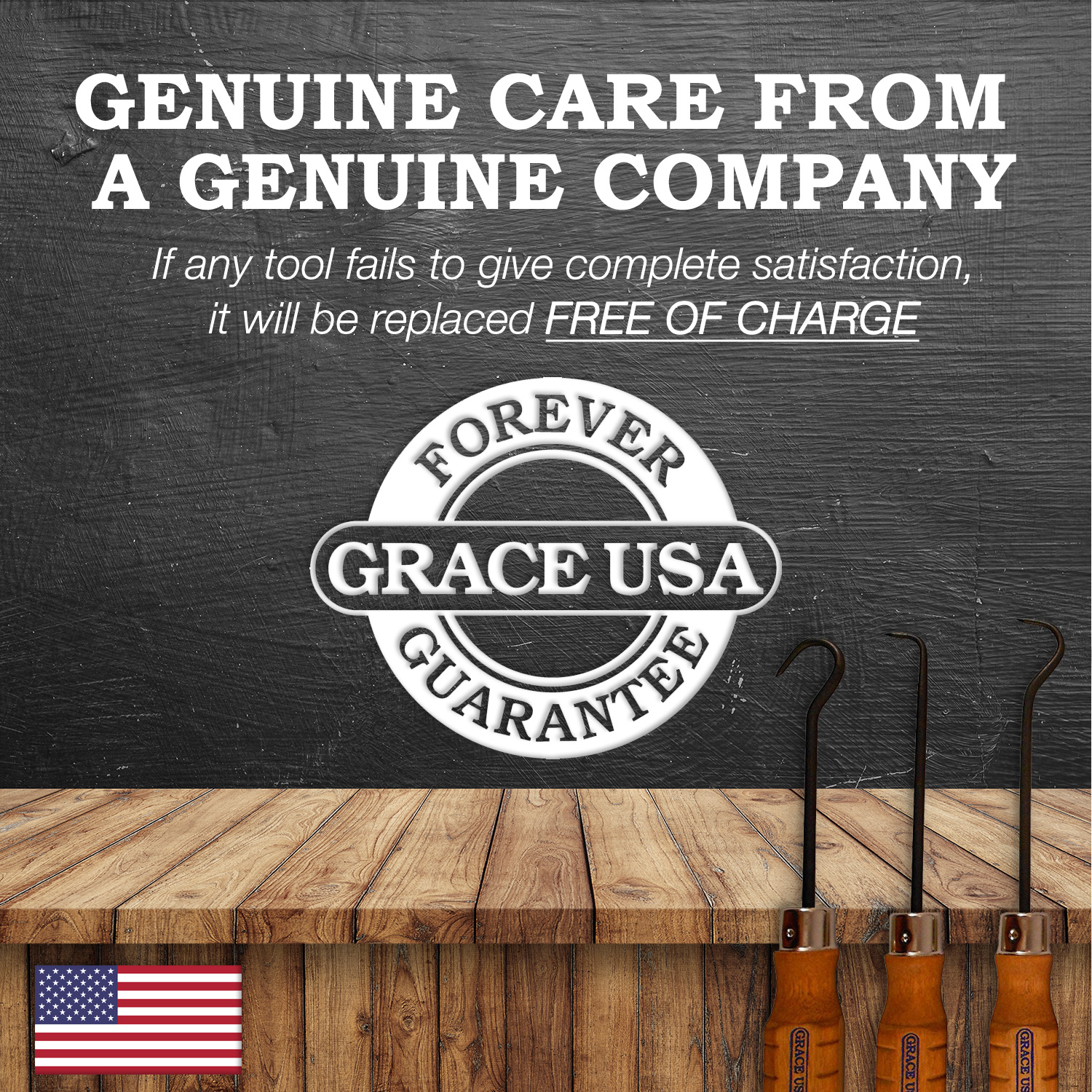 | Bulletpoint 6 | BACKED BY OUR LIFETIME GUARANTEE: Grace USA hand tools are Forever Guaranteed to be free of defects in material and workmanship. If any tool fails to give complete satisfaction it will be replaced free of charge. |