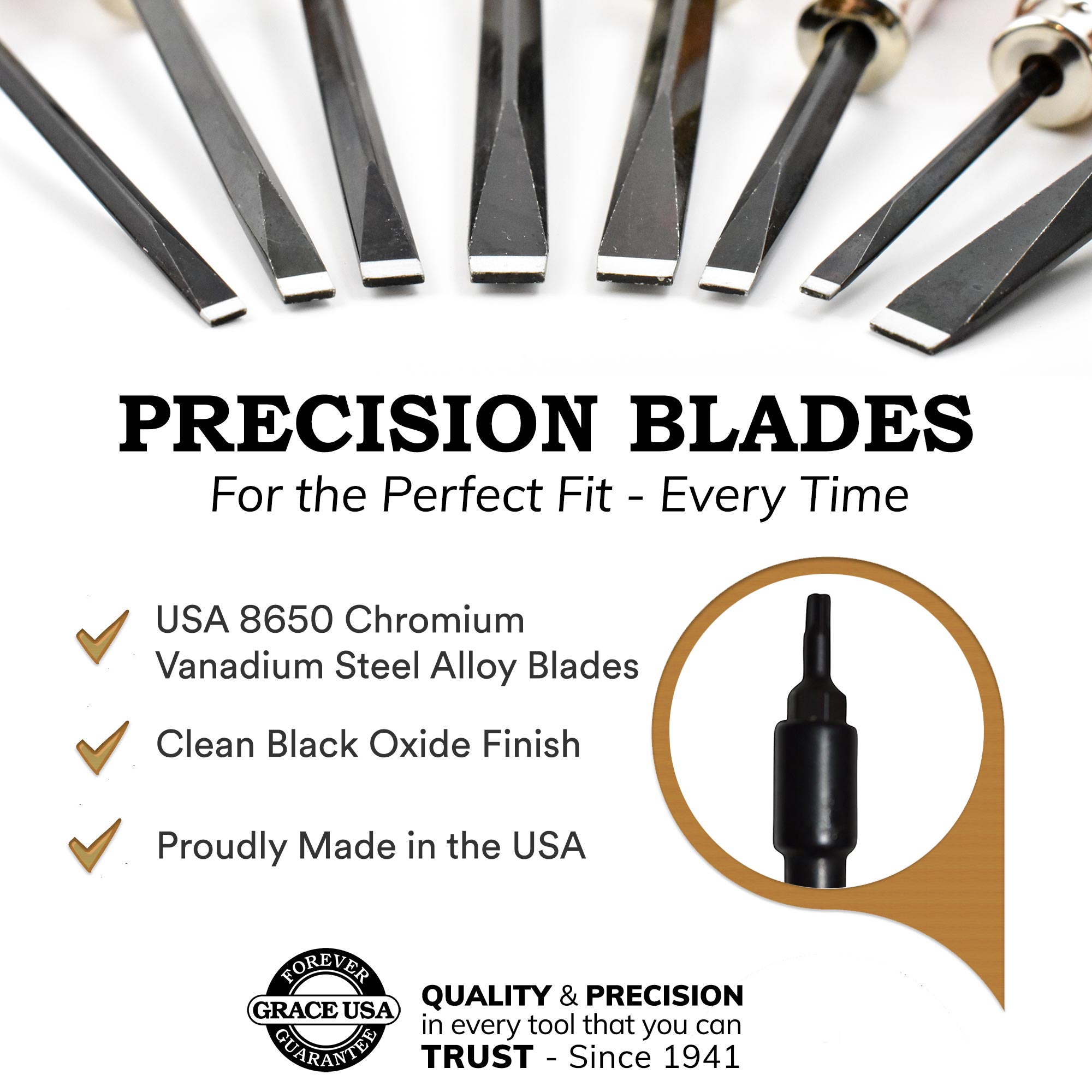 | Bulletpoint 2 | PRECISION FOR THE PERFECT FIT - EVERY TIME: This set includes 11 Grace USA Parallel Hollow Ground slotted bits, 3 Phillips bits, 8 Hex bits and 2 Torx bits all made of S-2 Tool Steel. |
